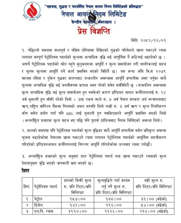काठमाडौँ । नेपाल आयल निगम लिमिटेडले पेट्रोलियम पदार्थको मूल्यमा भारी वद्धि गरेको छ । अन्तर्राष्ट्रिय बजारमा भएको मूल्य वृद्धि तथा आपूर्ति व्यवस्थापनको दबाब भएसँगै निगमले पेट्रोल, डिजेल तथा मट्टीतेलको खुद्रा बिक्री मूल्य बढाएको हो ।