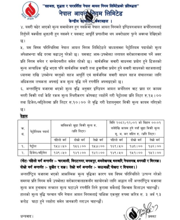 डिजेल र मट्टीतेल पहिलो वर्गः प्रतिलिटर १४१ रुपैयाँ ५० पैसा, दोस्रो वर्गः प्रतिलिटर १४३ रुपैयाँ र तेस्रो वर्गः प्रतिलिटर १४४ रुपैयाँ पर्ने भएको छ ।